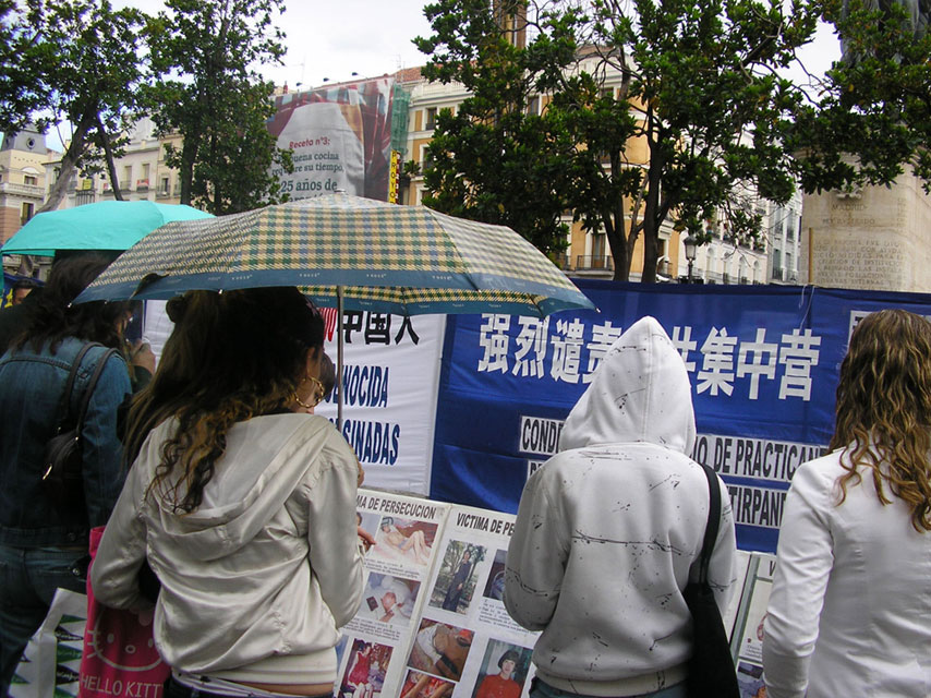 ![]() 展示中共迫害法轮功的图片刚刚摆出来,人们马上就聚拢过来观看 |
