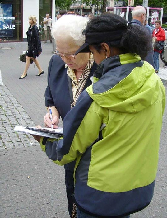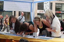![]() 法兰克福民众积极在“全球百万签名”簿上签名 |