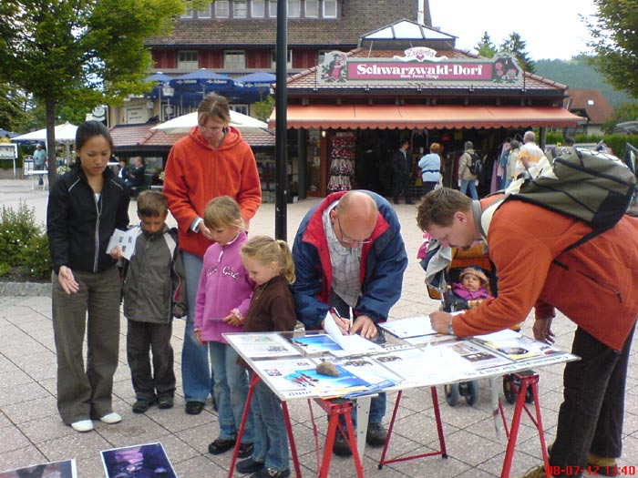当天,旅游景点游客络绎不绝。我们的信息台又设在了景点的入口处。游客们经过时纷纷驻足观看,展示中共恶警对法轮功学员施行的惨无人道的酷刑图片使很多人惊呆了,有人不敢相信这是真的。一个五、六岁的小女孩拽着妈妈问:“怎么会这样?这样人不就死了吗?”当了解到这些都是事实并且至今仍在发生着时,他们争相签名,支持法轮功,制止中共迫害。