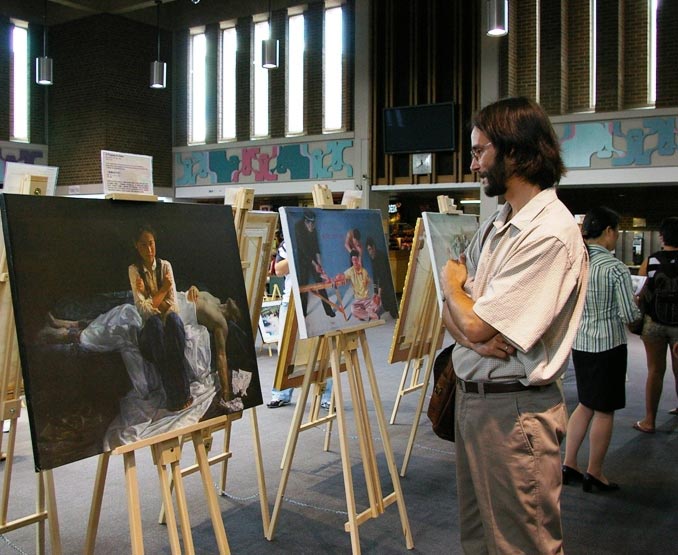 ![]() 艺术系主任肯•科绨斯(Ken Coates)在欣赏法轮功学员的作品。 |