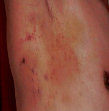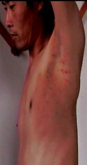 邪党人员们还气急败坏的用了下三烂的流氓手段:扒去泮玉军的上衣和内裤,在泮玉军的脸上、身上乱涂乱画;还对他进行性虐待。其中,三个恶人轮番对泮玉军进行殴打。姓秦的恶警用力专打两肋及腋下,造成了内伤,使他时常咳嗽,咳嗽时两肋内部疼痛难忍。有一个叫王大成的恶警点了一支烟放在了泮玉军的鼻孔里让他吸烟。迫害完了之后,施斌涛还邪恶的说,我们没有打你吧。简直是流氓。