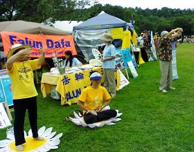 文化节第一天,学员们遇到了一位八十多岁的中国老太太。她非常高兴看到法轮功学员,并说:“你们是在做大好事啊,一定要坚持下去!我的儿子在国内是政府高级官员,快退休了,等退休了他也到国外来。”后来,又陆续有三四个中国留学生主动来索要揭露中共邪恶本质的《九评共产党》。