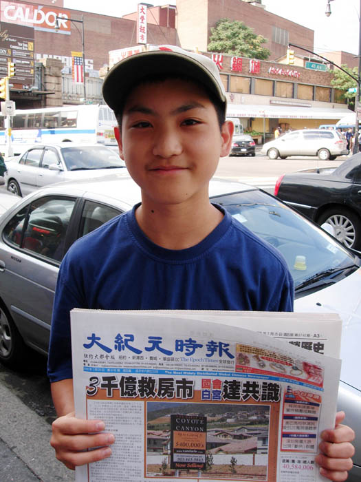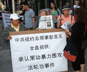有一半亚裔血统的福朗瑟西卡•库边(Francesca Kubian)站在中国城牌坊前看到一个横板上写着“中共纽约总领事彭克玉全盘招供:承认策动暴力围攻法轮功事件”(Chinese General Consul Peng Keyu Boasted Inciting the Hate Crime Against Falun Gong),把她吸引住了。她说:“看到这个牌子后,我惊呆了!这让我想起来几年前在纽约时报上看到的一篇文章,写着一个加州的法轮功学员去中国而被捕被迫害。他们(中共)是错的,法轮功不是政治,只是精神信仰,看来中共不能容忍任何精神信仰。”