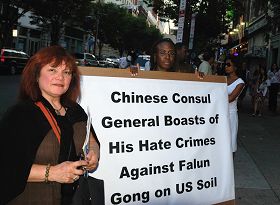 ![]() 库边女士(左)被牌子上写的中共纽约总领事对法轮功的迫害惊呆了 |