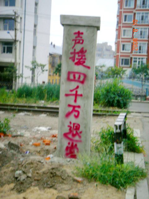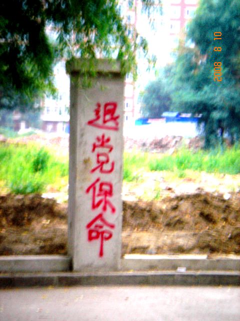 在道路两边的电线杆上、围墙上、家属楼的墙上、大树上等,出现喷漆和不干胶标语。喷漆喷出的标语有:天灭中共、退党保命、声援四千万人退党、信仰无罪,停止迫害、平反法轮功,法办江泽民。