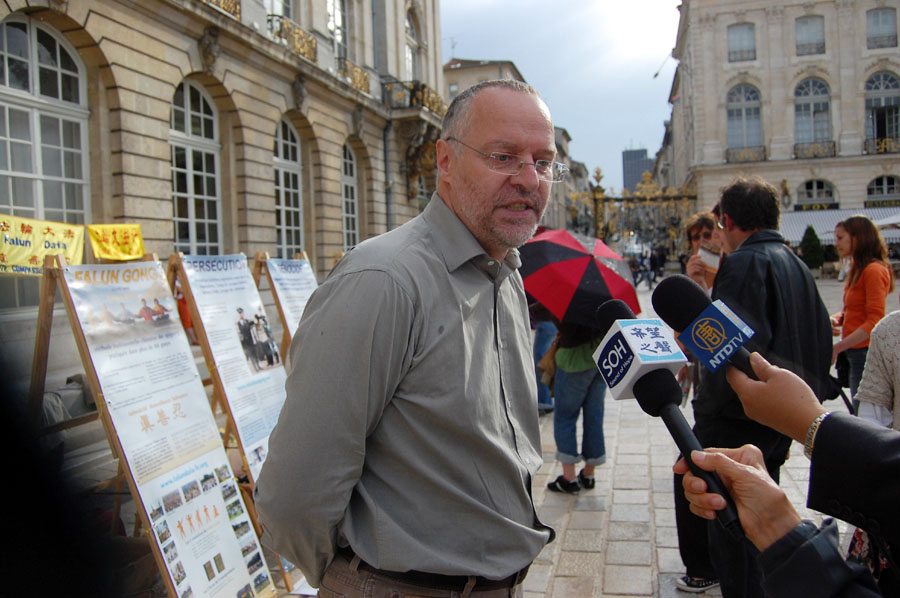 南希市副市长飞利浦.贝尔德(Berdaud)代表市长对这次活动给予肯定,他希望通过这样的活动呼吁全世界关注中共邪党对法轮功与西藏的迫害。在接受采访时,他表示:我们很感谢法国法轮大法协会主席出来揭露中共的暴行,同时也很佩服这个协会的勇气,这个勇气给人们一个希望。我们也观察到中共的施压政策是出于一种恐惧,这种恐惧可能是经济上的资本化使中国人与国际接轨而(使中共)失去意识形态的控制能力,还有北京与国际社会对奥运精神认识上难以抹平的冲突。”