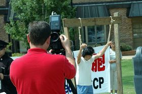 ![]() WCBI电视台记者在拍摄中共的吊打酷刑演示。 |
