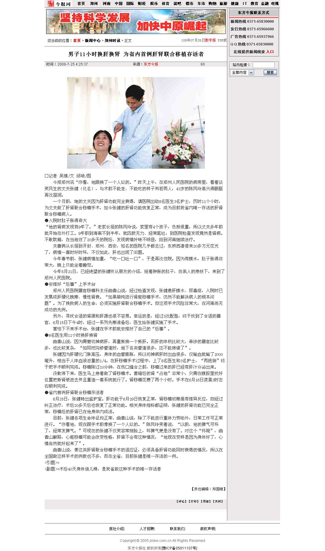 据《今报》郑州讯,6月15日下午4时,郑州人民医院器官移植科出动8名医生3名护士,为张健(化名)做了历时11个小时的肝肾联合移植手术。器官移植科主任曲青山参与。而这个肝肾联合移植手术只需三周的时间,就找到了合适的器官。