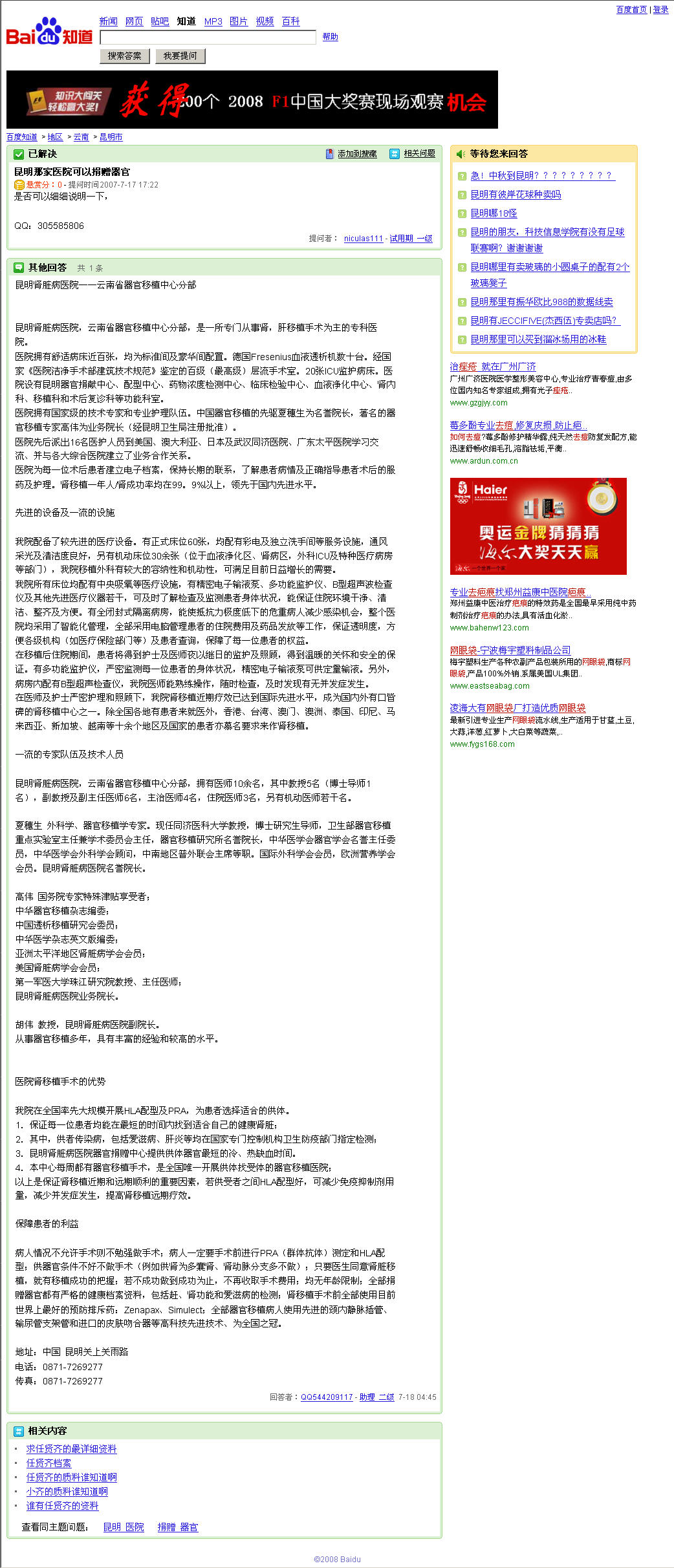 2004年2月下旬,经朋友及一位本地的肾病权威郑重安排下,正式和广东虎门太平医院接触上,同步收集该医院的资料,发现该医院鲜肾移植的病人去年高达300人以上。病人国内外的都有,且成功率在90%以上。血型化验报告在2月28日传真太平医院。4天后,接到院方通知已找到一个肾血型和组织八分吻合,可以马上进行移植。