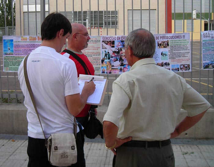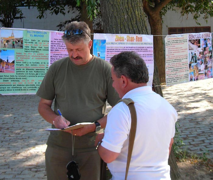 听了真相,很多人都表示希望能对法轮功反迫害提供帮助。FLORENTINO主动询问可以帮什么的行人。由于学员一时找不到笔,没提出让他签名。经他提醒,便拿出征签表,FLORENTINO拿出自己的笔,高兴的在“揭露邪党恶行,呼唤正义良知”的征签表上签下姓名。