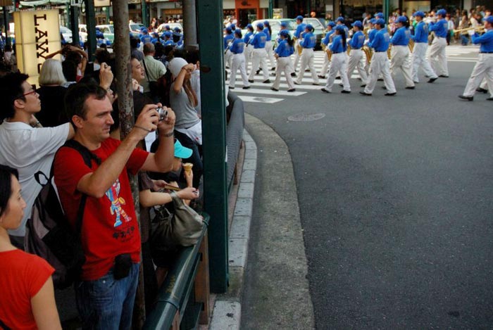 由近百名法轮功学员组成的天国乐团也参加了游行,这是天国乐团首次在大阪和京都亮相,精彩演奏吸引了大量行人驻足观望;观众们赞声不绝。