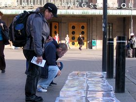 一位芬兰女士在征签桌前转了好久,最后对Anija说,她有一个亲戚是位中共的官员,所以她不敢签名,但她要了九评和法轮功被迫害的传单及英文的《九评共产党》报纸。