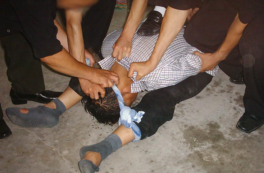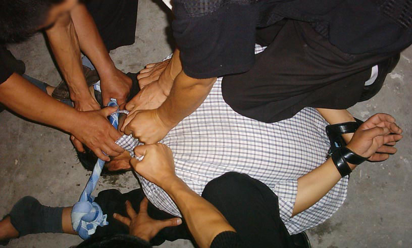最后我被按到了铁桌下,他们先把我的腿水平固定在地面上,大约四个人勉强按住我的脚(双腿成30度角),使我不能动。剩下的几个人把我的脖子绑在两个小腿肚上,然后开始往下压我后背。我是个大块头,身材又高又胖,当时体重有90公斤,肚子大。平时坐着最多也只能保持上身与下身成90度角。而此时却把我的上身压平与下身成0度角,肚子被压错位挤到两侧,脖子与脚踝骨成一条直线。然后用床单把我的脖子和脚一起固定住,这使我上身不能抬起一点。这时我的面部和腹部同时触到地面,而后又把我双手反绑。
