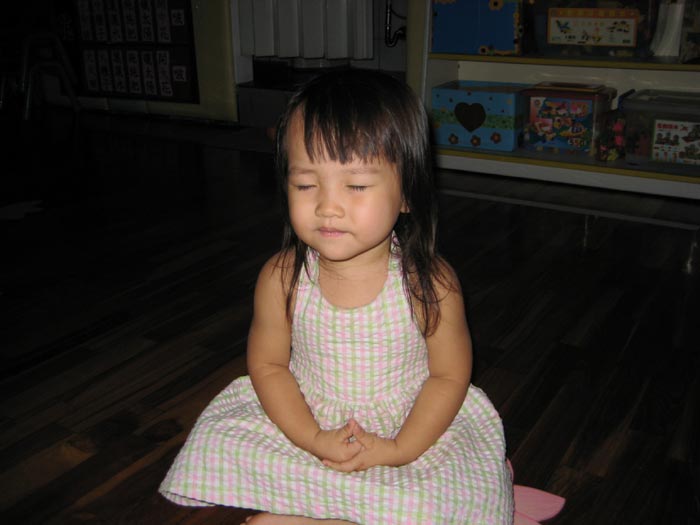今天学法读的是《转法轮》第一讲中的“法轮大法的特点”,小朋友手指头点着念读的地方,跟着老师一字一句的读,五岁多的小洪薇认真又专注。来接她下课的妈妈表示,十年前在大陆家乡即已接触大法,知道法轮大法好,很可惜没有真正走进大法中来。她说:“豆豆园是以真善忍为教学基础的,各方面也都有做到这样一个标准,我希望洪薇从小接触这样一个环境,可以让她保持天真善良和正直的品格。”