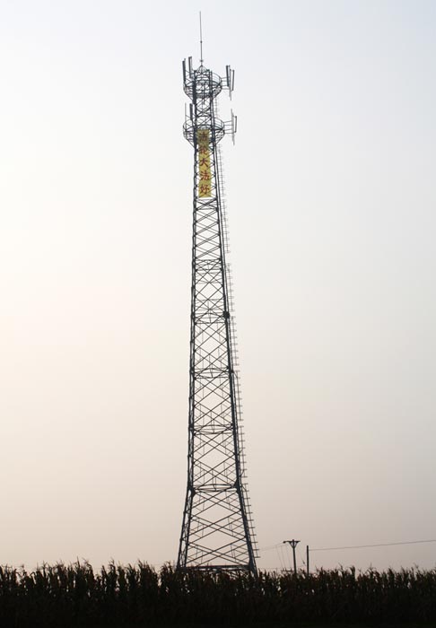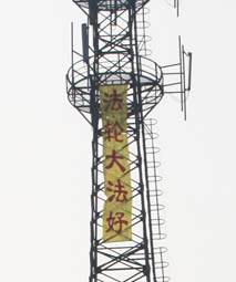 08年中秋,大法弟子把“法轮大法好”的条幅挂在辽宁省某市铁塔上。条幅长十