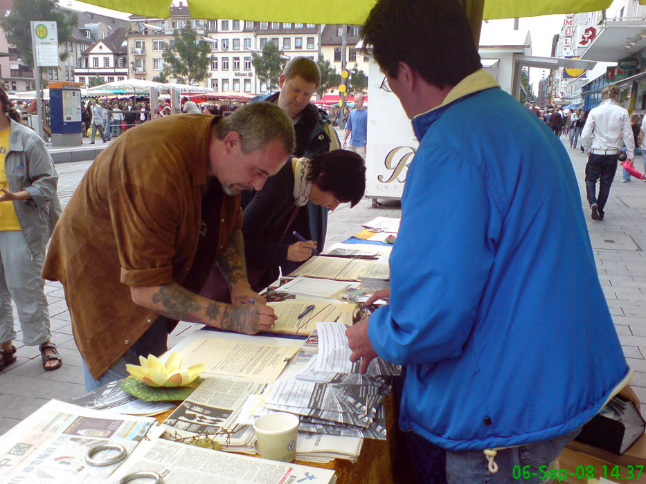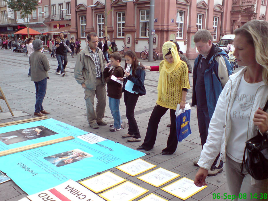 【明慧网二零零八年九月七日】二零零八年九月六日,法轮功学员在德国南部城市曼海姆举办了信息日,向人们介绍什么是法轮功以及中共如何残酷