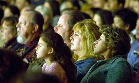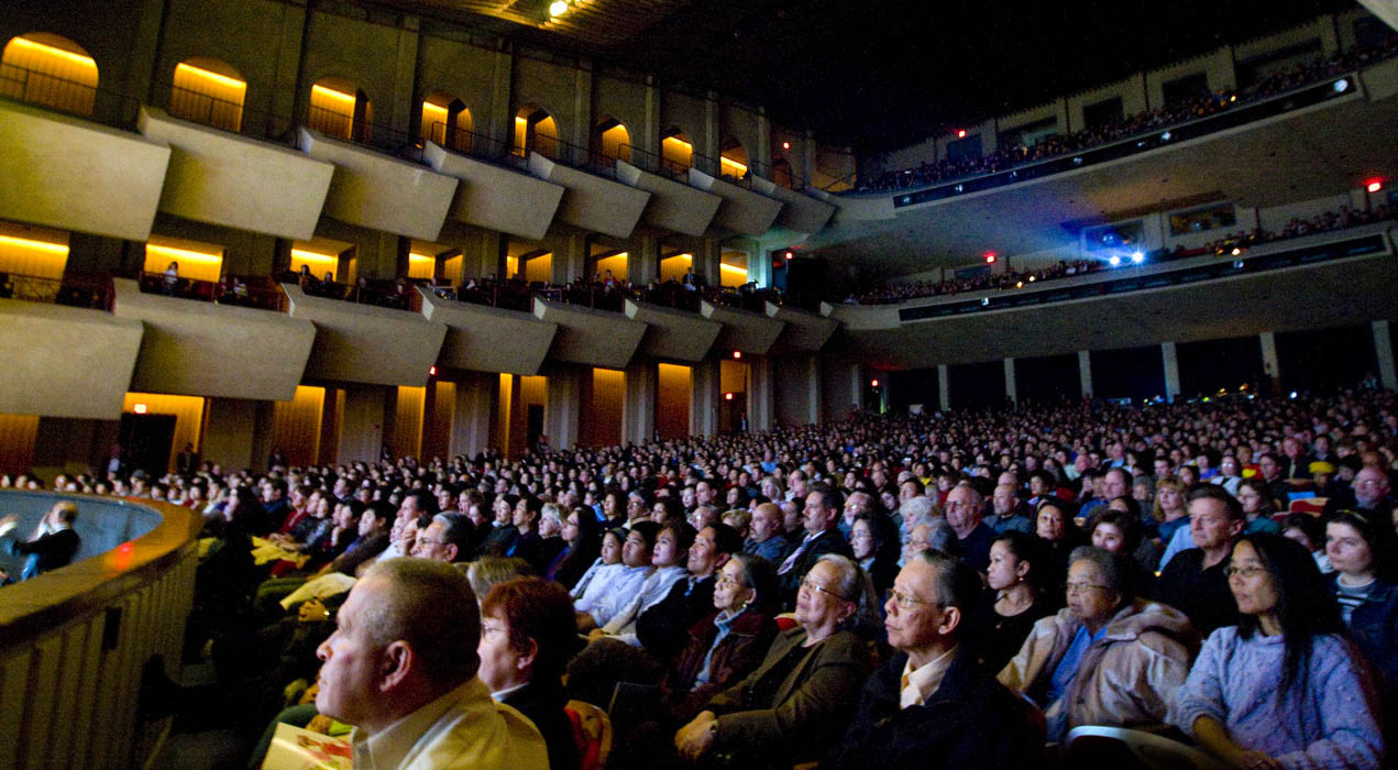 ![]() 二零零九年一月十五日晚,美国神韵国际艺术团在旧金山湾区硅谷重镇库柏蒂诺弗林特艺术中心压轴场演出的观众。 |