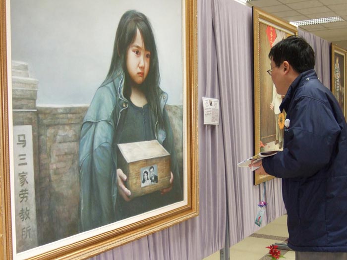 一位退休律师到县政府洽公,看到了画展,他对画作《天人合一》中打坐者的表情露出了向往,他说他曾经盘过腿但很痛,看到这幅女士打坐的油画,感觉很舒服。而当他看到修炼者被中共迫害的画作时,眼眶红了并掉下泪来。