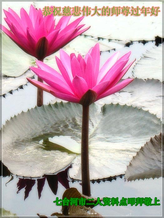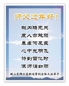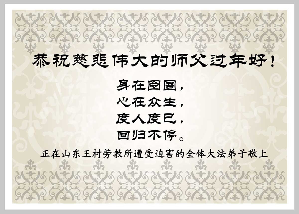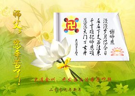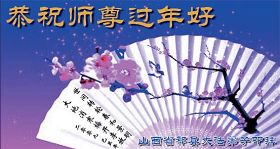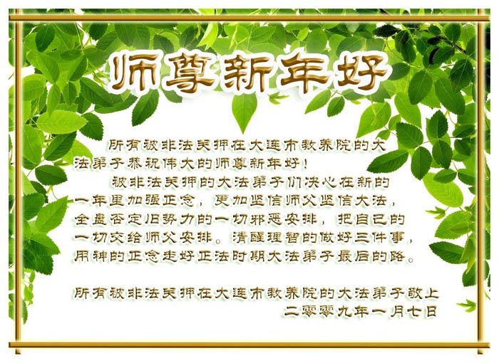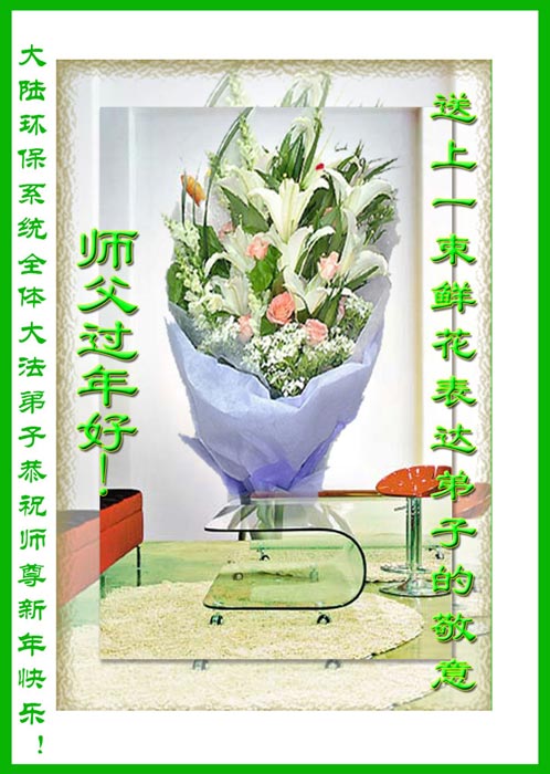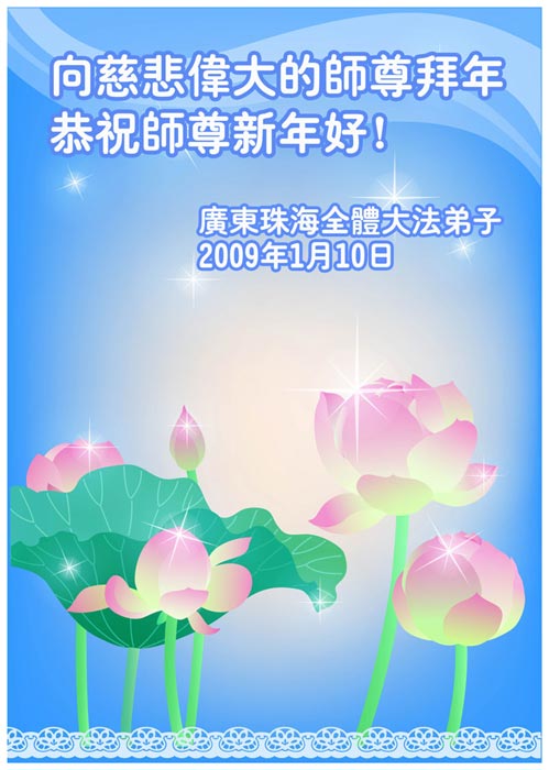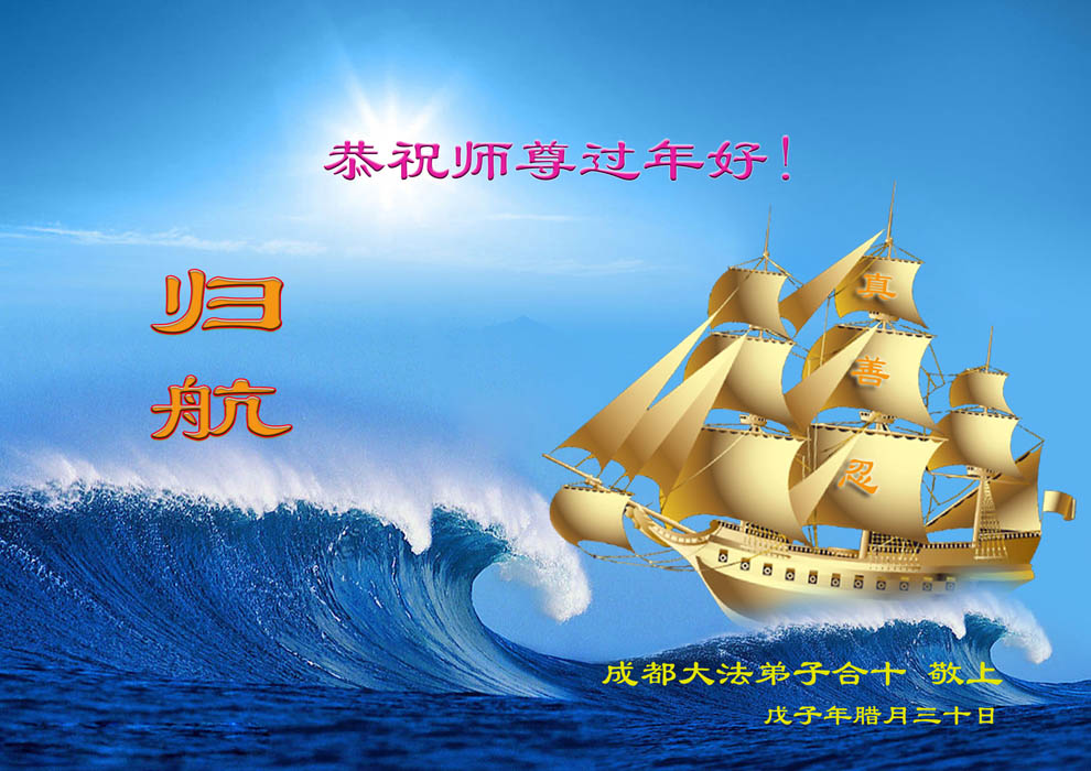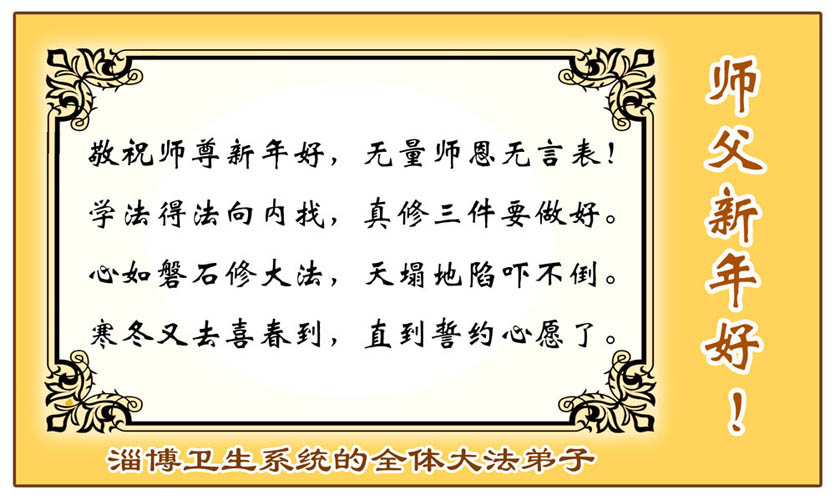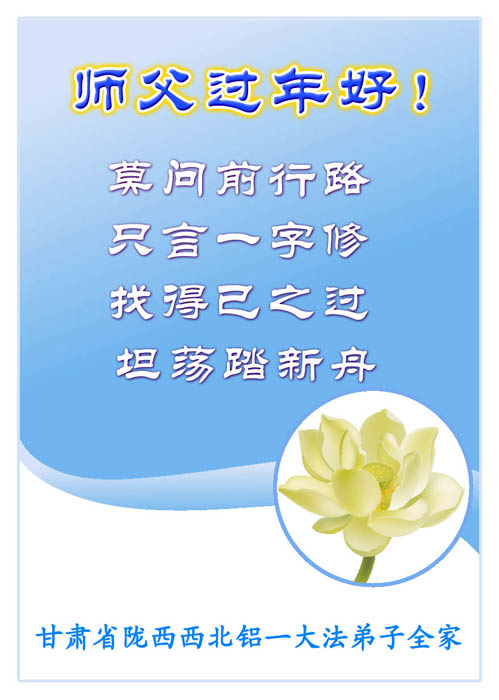 在中国新年到来之时,我们怀着无比崇敬至尊至高的心情衷心祝福师父中国新年快乐!弟子们想念师父,多想与师父同在,返本归真,回到我们真正的家园。为此只有加倍努力做好三件事,无条件的向内找,修去为私为我的旧宇宙观念,去掉最后根本的执着。讲清真相、救度众生,正念正行,完成正法时期大法弟子的伟大使命!