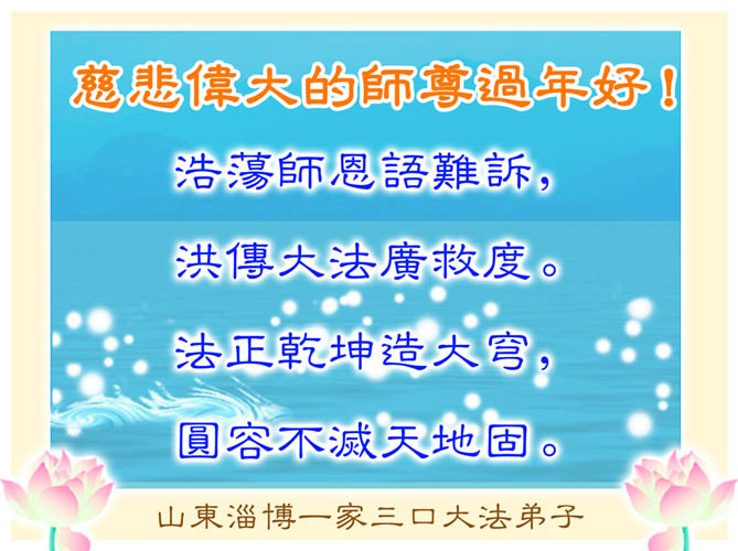 在己丑年新年来临之际,我们一家九位大法弟子怀着崇敬的心情向慈悲伟大的师尊拜年!祝师尊新年快乐!感谢师尊的慈悲救度!