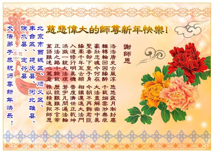 慈悲伟大的师父啊:北京西三旗、马家堡、大兴区、空军大院大法弟子给您拜年啦!