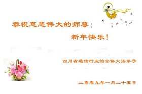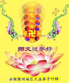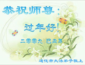 我是一名在中国大陆公安工作的大法弟子。在一年一度的中国传统节日“过年”到来之际,恭祝师尊及家人新年好!您的弟子决心在新的一年,在特殊的工作环境修好自己,同时理智智慧地讲真相劝三退,不辜负师尊的殷切期望,完成好自己的史前大愿。2009-1-23
