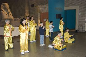 法轮功展位前吸引了很多有缘人前来咨询,有的游客当场就跟着旁边教功录像带演示的功法炼了起来。法轮功学员于中午十二点多在Lower Egyptian Gallery做功法演示,吸引了很多人前来观看,不少人当场跟着炼了起来。学完后,一位女士说:“舒服极了!我还要炼。”