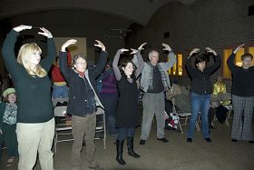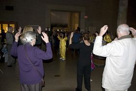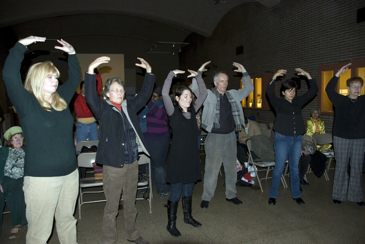 十一年前,法轮功学员第一次将法轮大法带到了宾大博物馆,就是在这个活动中很多有缘人得法了,其中包括今天正在作功法演示——打坐的泰瑞。当时正得了莱姆病(Lyme)晚期的泰瑞,她的每块骨头、每根肌肉纤维都疼痛着,半个身体没有知觉。在那次活动中,她的一个中国朋友听到了法轮功,并带给她《转法轮》这本书。 从此她获得了新生,不但疾病无影无踪,更重要的是知道了生命的价值。