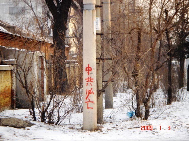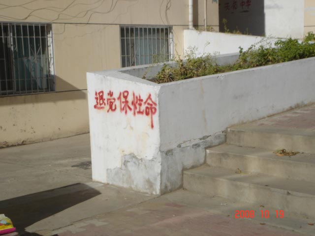 “天灭中共”、“退党保命”、“声援四千八百万人退党”、“中央党校25名高官集体退党”、“法轮大法好”、“信仰无罪,停止迫害”、“平反法轮功,法办江泽民”、“法轮功被迫害千古奇冤”、“欢迎法轮功,法办江泽民”、“大法救人,恶党害人”、“天灭腐败党”、“中共是万毒之源”等;