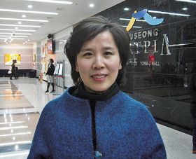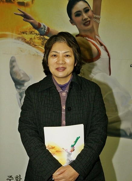 身穿宝蓝漂亮外套的韩国知名传统婚礼研究家徐德顺女士,是大邱庆北民俗文化保存会会员,去年因为没能看到神韵的演出而遗憾,这次还差点因为把票忘在了家里而错过演出。她今天穿着自己设计的衣服出席神韵在大邱的演出,她说舞蹈演员们的服饰深深的感动了自己。