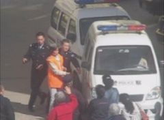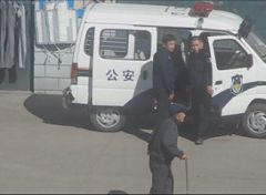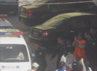 庭审后亲友们涌向警车向胡其利挥手道别(图片下边穿红衣挥手者为胡其利的婆母)
