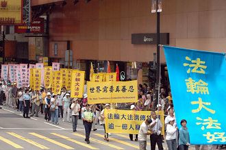二零零九年十月一日,香港举行声援六千一百万勇士退出中共大游行,“法轮大法好”旗帜在居住了大批大陆新移民的香港北角街道上飘扬。