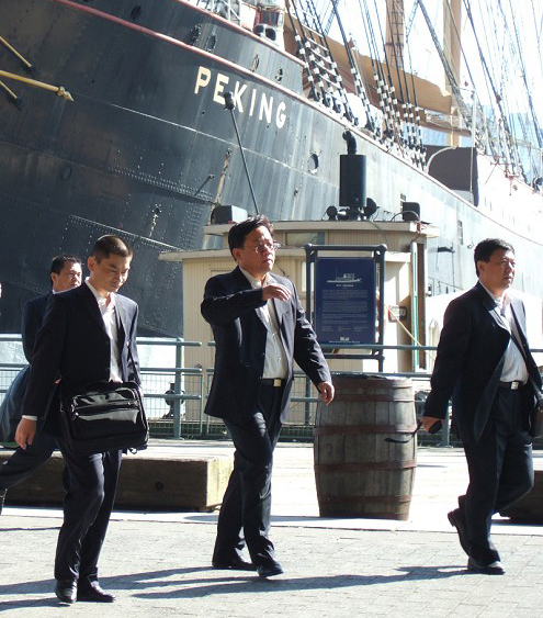 ![]() 广东省劳教局局长兼党委书记施红辉(中)与随行者在纽约十六号码头。 |