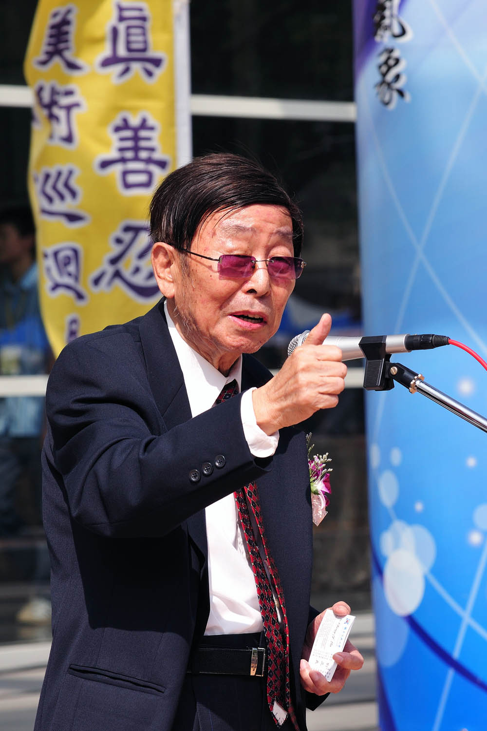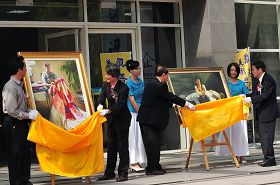 开幕仪式在社科院前举行,新唐人旗鼓队的隆隆鼓声在秋阳的照射下,让现场更为热闹。法轮大法学会代表刘正义教授致词感谢中兴大学对于美展的支持,提供很好的场地,在中兴大学法轮功社团的协助下,能顺利展出。