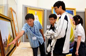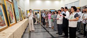 ![]() 建国中学美术教师周怡秀为来宾导览画作。第一排右一为台中市市议员邱素贞,右三为台中市市议员陈福文。 |