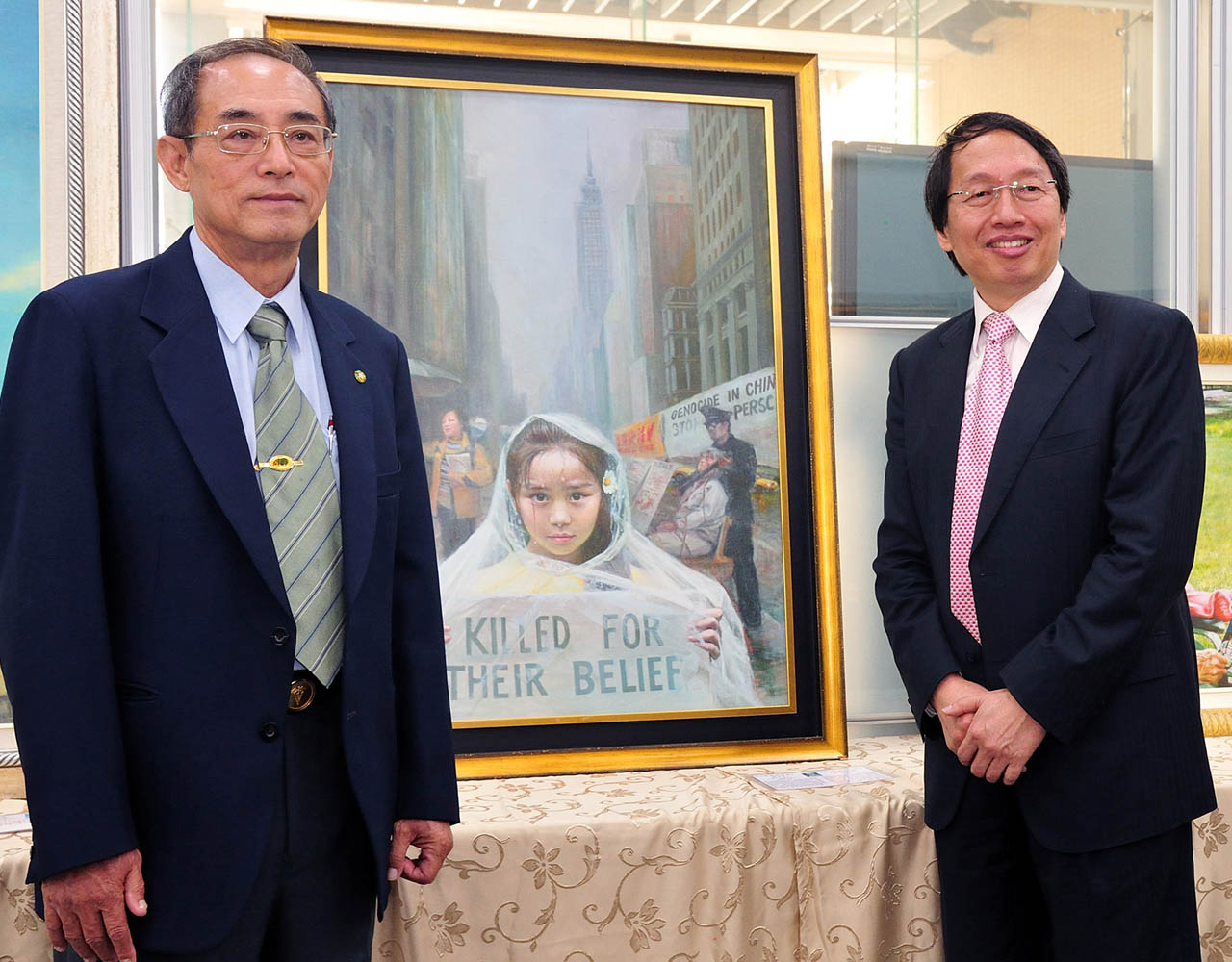 ![]() 法轮大法学会代表刘正义教授(左一)和中兴大学副校长叶锡东在画作前合影。 |