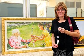 来自中欧国家斯洛文尼亚(Slovenia)的塔吉雅娜(Tatjana Gec)小姐,利用在台湾参加学术交流的空当前来参观画展。观看画展后,她表示非常认同“真、善、忍”,而她感受到这些法轮功学员都是很好的人。她相信不管人怎么做,都不可能破坏信仰。