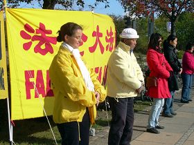 全副武装站在街对面的警察,看着学员不为初秋风雨变换的天气所动,一直这么安详地炼功打坐。这种不一般的宁静场面吸引了警察们,有的甚至在他们间隙休息时,走过街对面来,模仿学员学一阵功法动作,有的过来听着学员们介绍法轮功的美好,产生了极大的兴趣,表示想学功,也有的听着学员介绍发生在中国的迫害,表示对法轮功无保留地支持和理解。