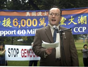 “中国民主后援国际”组织(China Support Network)的创始人库萨密先生(John Kusumi)发言表示,二零零五年时他曾参加退党集会,庆祝一百万人退出中共,而今这个数字已经到了六千万了,这是真正的发自中国人心底的声音。库萨密先生说,这六千万人把他们的勇气汇聚在一起,他们是真正值得敬佩的。