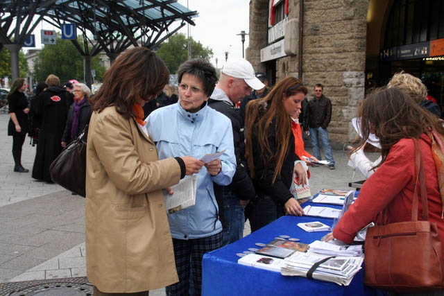 【明慧网二零零九年十月八日】二零零九年十月三日,法轮功学员们在德国汉堡总火车站前举办了一个信息日,揭露中共对法轮功长达十年的残酷迫害,呼吁更多的人关注自《九评共产党》一书问世以来已有六千多万中国人退出共产党、共青团和少先队的盛况。