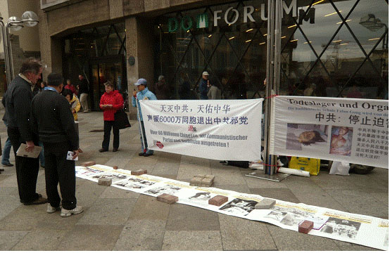 本次活动是德国退党服务中心组织的退党活动的一部份,同样的活动还在柏林,慕尼黑和汉堡举办。在科隆大教堂前,一个八米长的横幅上配有图片,详细揭露了中共六十年来迫害中国人的历史。两个分别六米长的横幅向世人传递六千万中国人退出中共的信息,以及中共活摘法轮功学员器官的行为。看过图片后,很多人在反对活摘器官的征签表上签名。