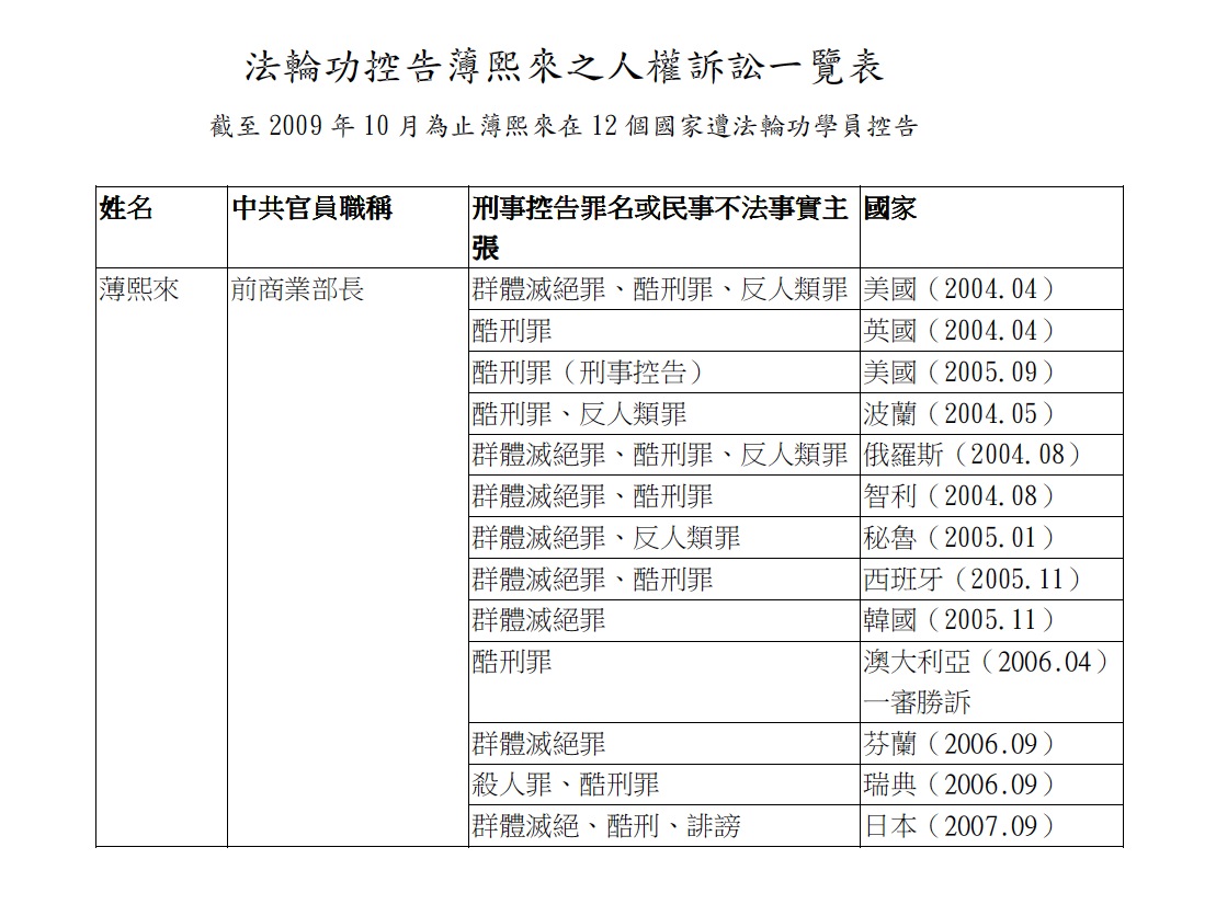 截至今天为止,薄熙来已经在十二个国家以群体灭绝罪、酷刑罪、反人类罪的罪名,遭到法轮功学员的控告。二零零四年,薄熙来第一次以商务部长的身份,随同中国国务院副总理吴仪访问美国时,在下榻的酒店亲自收到法院的传票。澳洲纽省高等法院于二零零七年十一月,裁定法轮功学员一审胜诉,薄熙来败诉。
