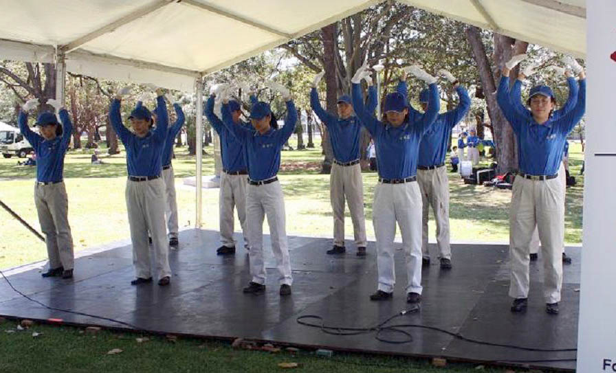 ![]() 法轮功学员在艾士菲(Ashfield)市“多元文化节”上摆放了摊位,向民众介绍法轮功。 |