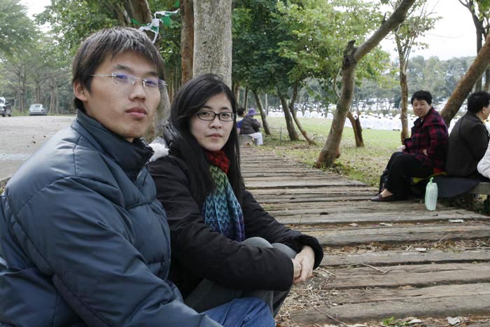 ![]() 台中市民陈志佑与蔡佩盈静静观看法轮功学员的排演 |