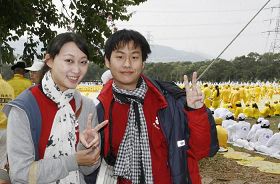 东华大学萧乔轩与实践大学颜怡柔,直呼场面太壮观,很震撼,颜怡柔表示她经常在西子湾景点看到法轮功学员讲真相。