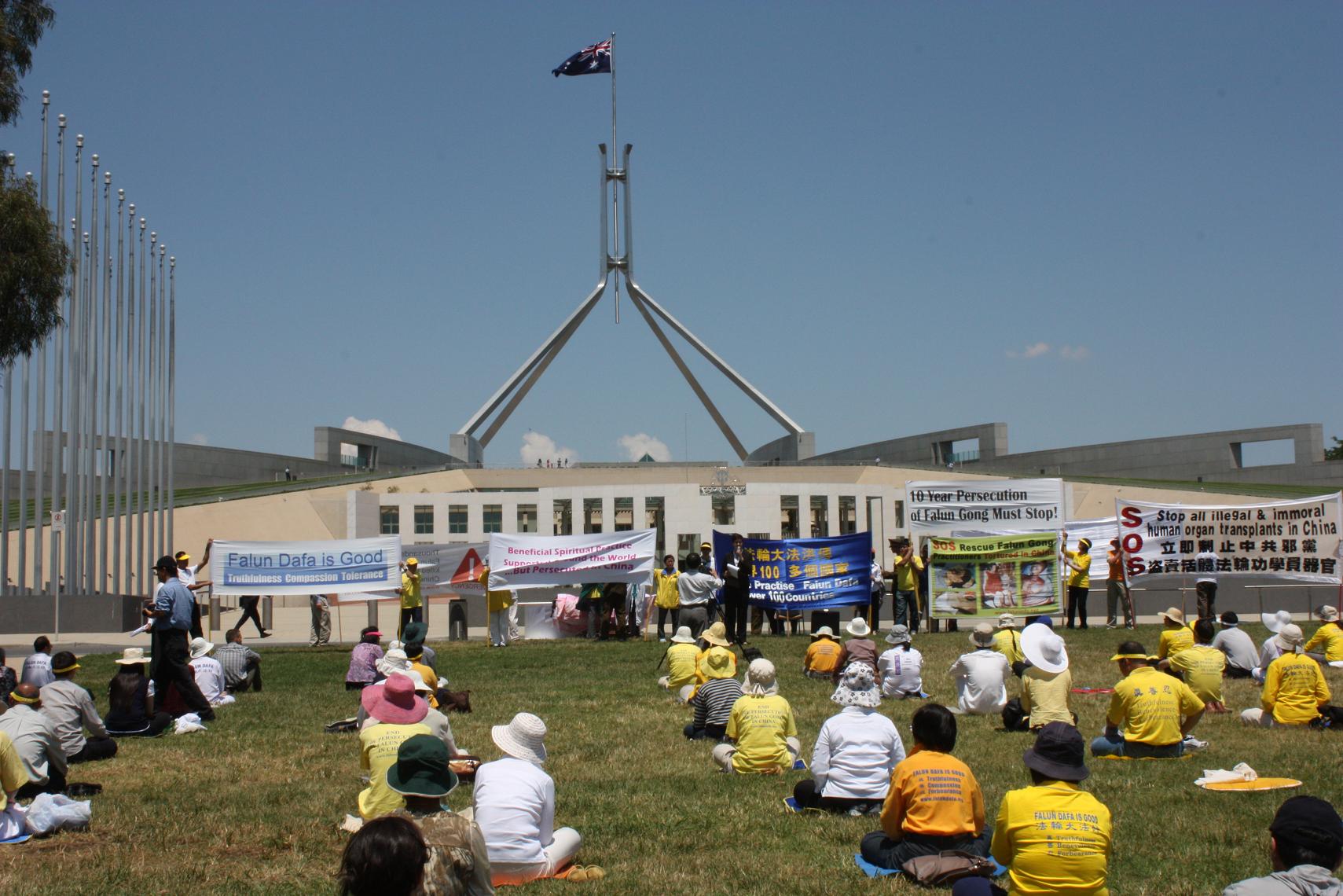 ![]() 澳洲法轮功学员国会山庄前集会,呼吁结束中共十年迫害。 |