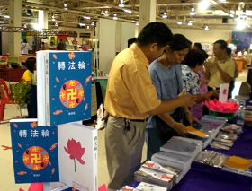 在博览会的展位上,法轮功学员摆放了美丽的纸莲花、大法书籍、真相资料,放映着教功录像片,并布置了大法洪传各地以及在中国遭受中共恶党迫害的图片展,来往参观者络绎不绝。