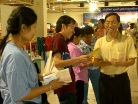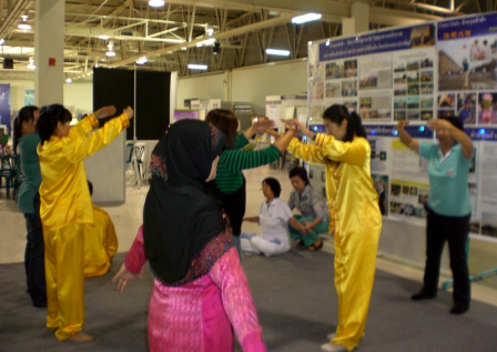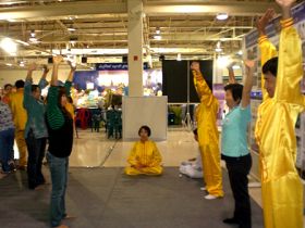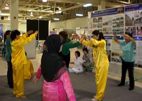 ![]() 法轮功学员每天在博览会的舞台上表演法轮功功法,并有学员在旁讲解,及介绍在中国发生的迫害。 |
