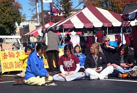 四个从堪萨斯来的非洲裔美国女孩儿路过免费教功的展位,听到这么好的功法在中国大陆受到迫害,她们很惊讶竟会有这样的事情。在了解了法轮功和迫害的真相之后,她们当场就跟着炼起功来。很多美国学生都对第五套功法感兴趣,跟着法轮功学员在展位前面学习打坐,有几个人立即就可以双盘。