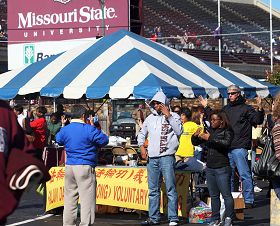 密苏里州立大学位于密苏里州春田市,是该州的第三大城市。在今年举办的返校节游行中,法轮大法社团带来了美丽的花车、祥和的功法演示、端庄多姿的仙女和精神抖擞的中国唐鼓。